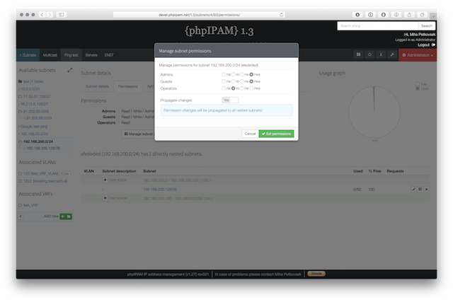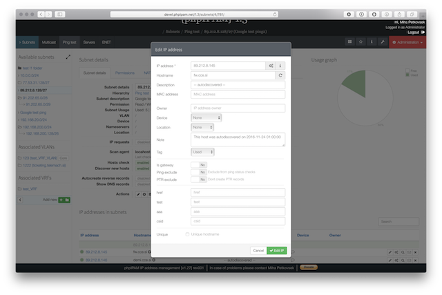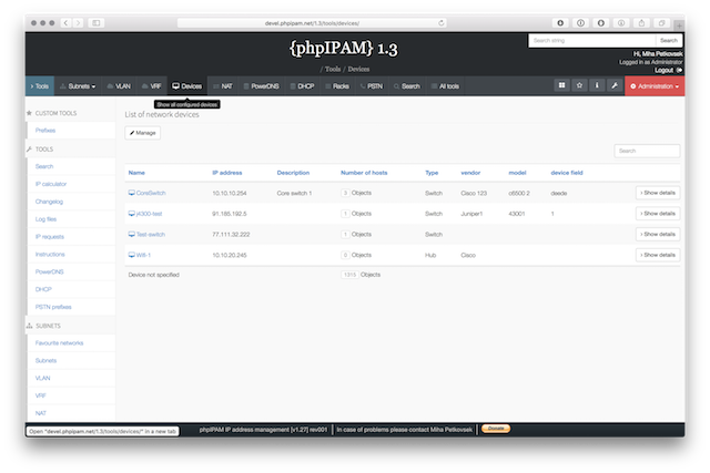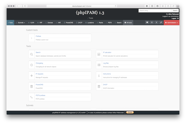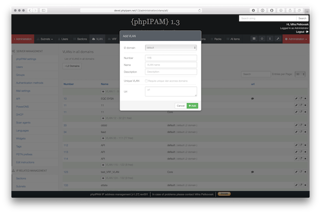 Below are some screenshots form latest release. You can see latest release of phpipam in action by visiting http://demo.phpipam.net !