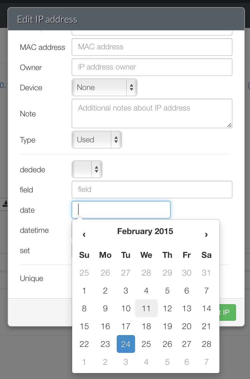 - datetime: adds datetime field, that is represented with date and time dropdown